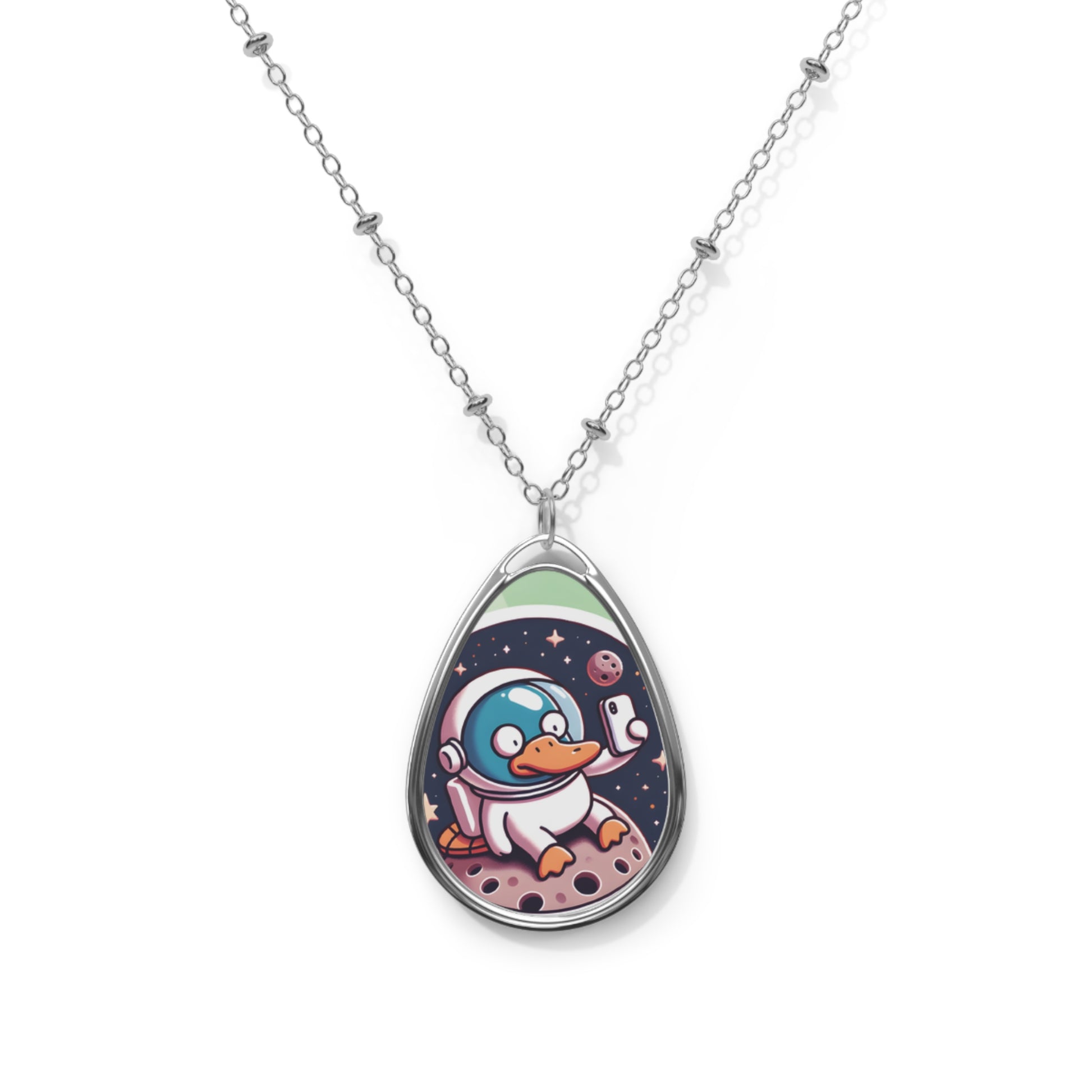 This platypus astronaut chilling on an asteroid is your reminder that your skincare journey (and life) is uniquely yours—totally out of this world! Whether you're glowing up or just enjoying the ride, this sleek oval pendant necklace is the perfect way to carry your confidence with you.